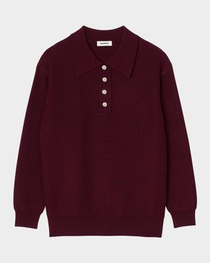 Sandro "Alfonso" cableknit sweater Polo collar; partial button front Dropped shoulders Long sleeves Hip length Pullover style Acrylic/wool/nylon/polyamide Unlined Hand wash Imported