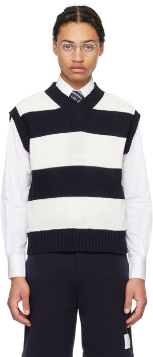 Knit cotton vest. Stripes throughout. · Rib knit V-neck, armscyes, and hem · Logo patch at front hem · Tricolor grosgrain flag at back collar Supplier color: Navy