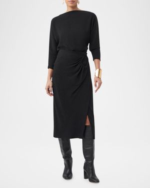 Trina Turk "Abiba" fauxwrap crinkled midi skirt with circle side gathering Sits high on the hips Side slit hem Hem falls below the knee Pencil silhouette Invisible back zipper Viscose/nylon/polyamide Unlined Hand wash or dry clean Made in the USA from imported materials
