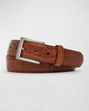 W. Kleinberg belt crafted from matte American alligator leather Approx. 1.375"W Handmade to order Rectangle prong buckle Leather loop Adjustable fit Leather/nickel Wipe clean Made in USA